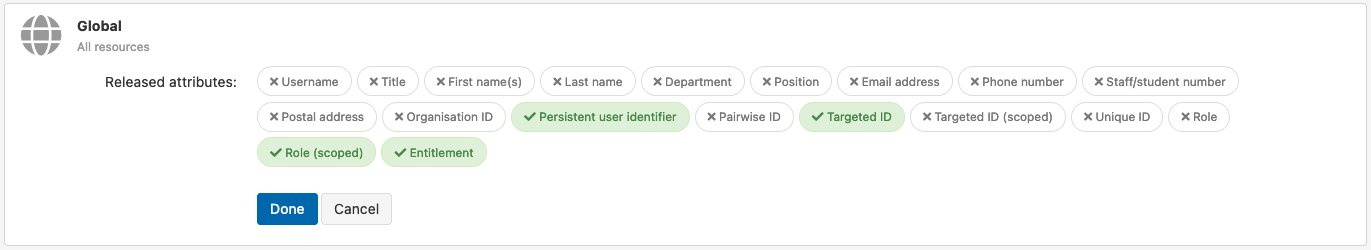 It’s possible that the way a resource’s SAML login works might need the user identifier to be sent as NameID instead of an attribute. If this comes up, you need to first set up release of the attribute to the resource as above, and then hit the advanced button below the pills. This will let you set the SAML NameID format and attribute.