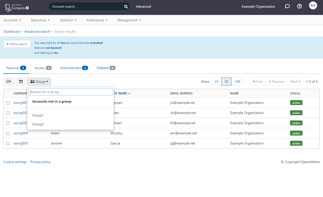 If you limited your search to your own OpenAthens accounts (rather than including those of sub-organisations) there will be a groups button available which you can use to further filter results to a single group. Group filters only apply to the account type you are viewing; they can be renamed or removed on the groups page.