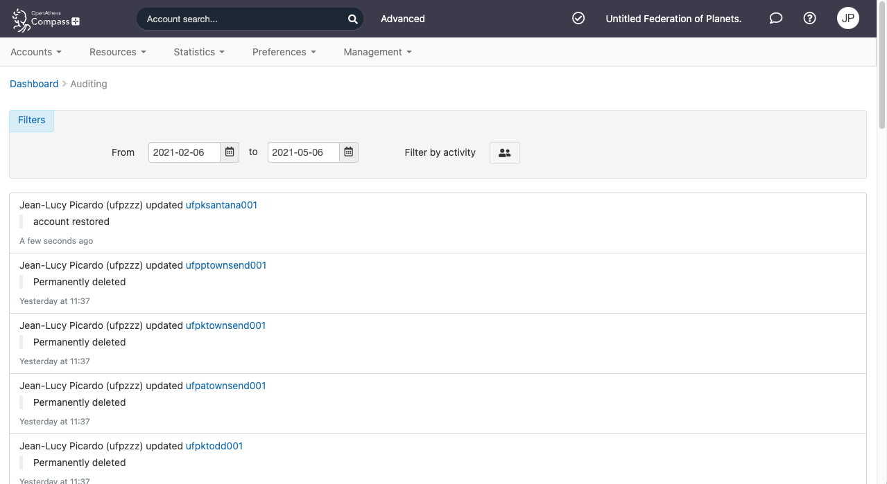 The audit page displays a combined stream of the main activities across all of your accounts actions - it includes things such as created, activated, and deleted but skips things such as email address or password changes. Clicking on a username will take you to that account's details page and a filter is available if you are interested in specific activities.