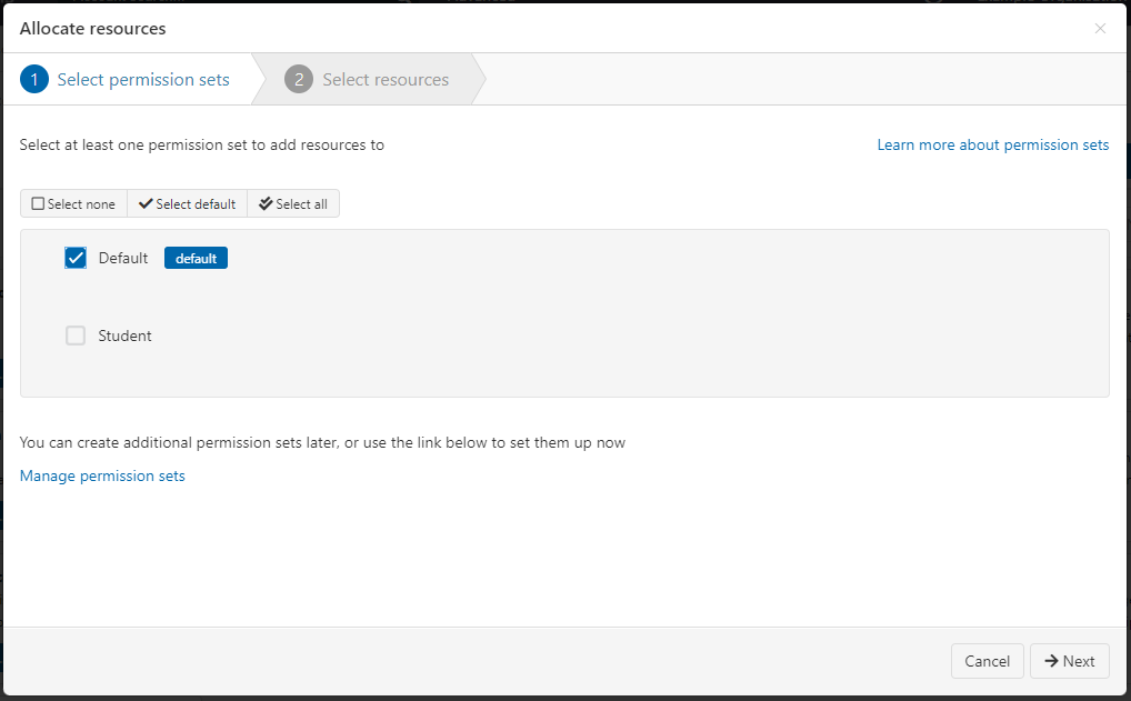 On the first page, select the permission sets that you want to add resources to. The options at the top will let you select all permission sets, only the default ones or none.