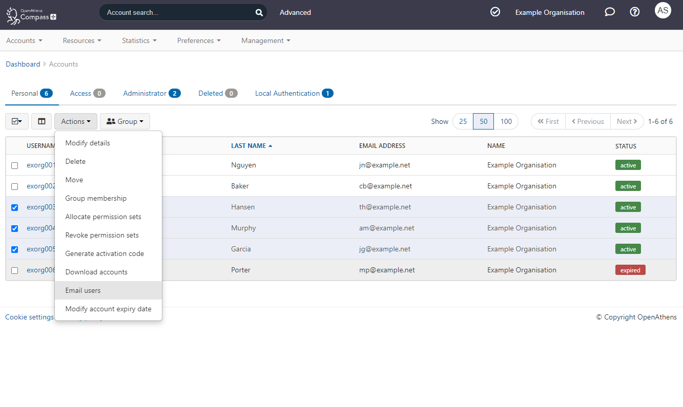 Select the OpenAthens accounts you are interested in on any search results page such as list accounts, accounts not activated or advanced search and select the 'Email your users' action. This option is not available for local accounts.