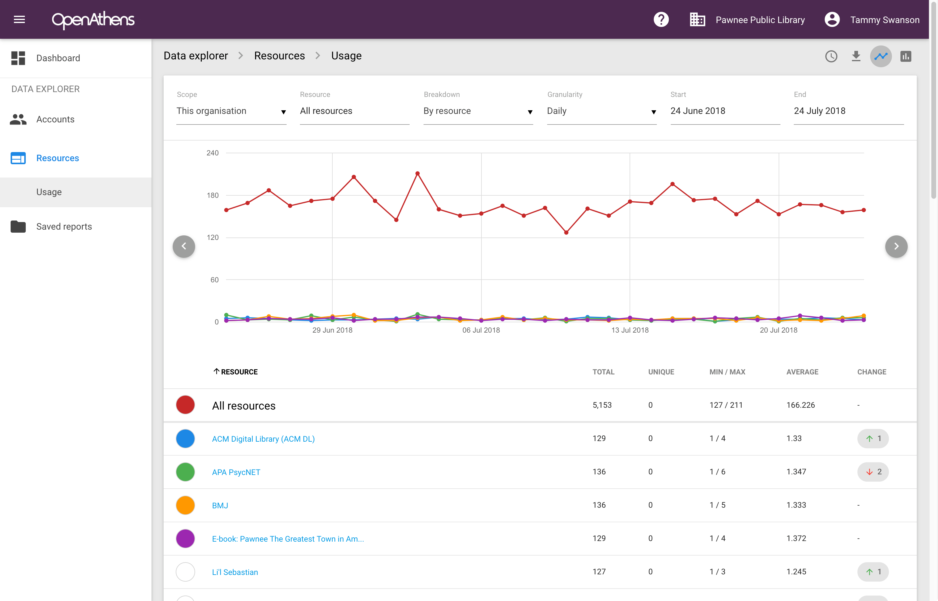 These breakdowns can be viewed for all resources or a single resource by selecting a resource from the dropdown at the top of the page or clicking on a resource name on the all resources view.
