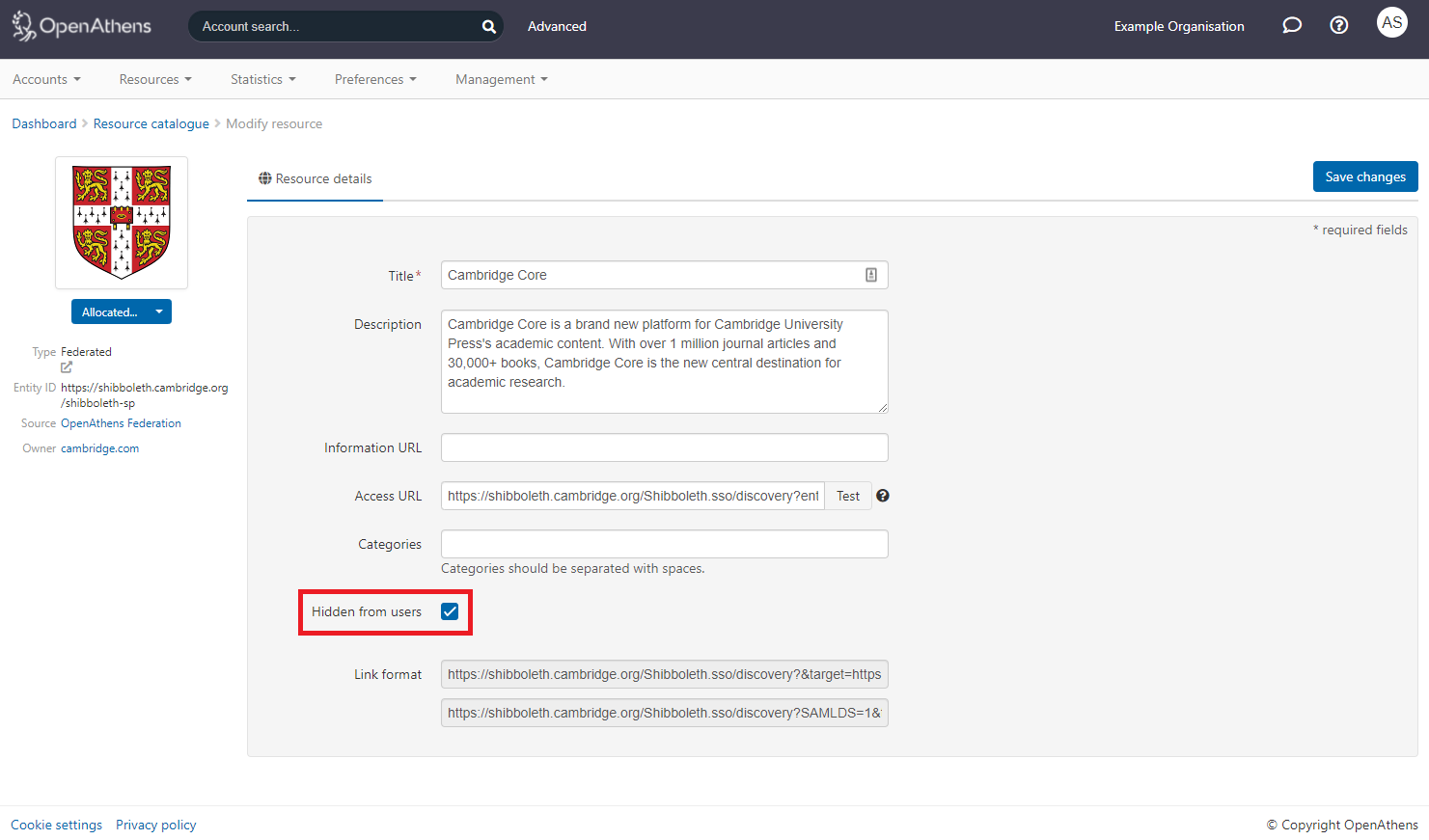 Depending on why you are doing this, you may not want your users to see that original resource in MyAthens. In restrictive mode it cannot be removed from the permission set without affecting access, so you can set it as hidden from users via the details view. The visibility setting on a resource is per administrator, so sub-administrators can choose if visible or invisible is best.