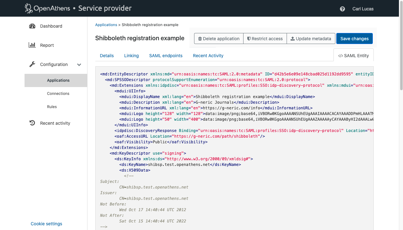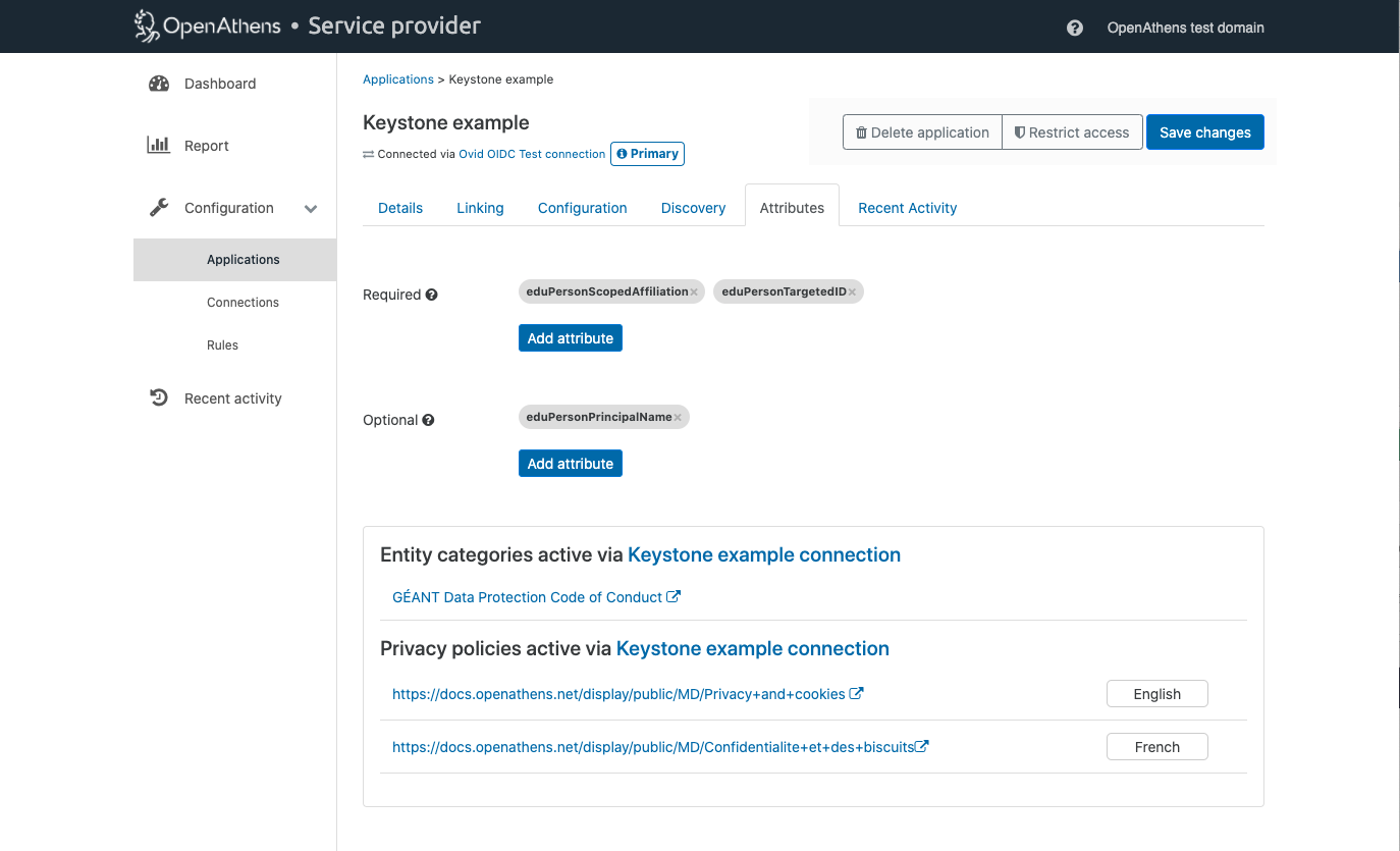 External applications such as Shibboleth: the entity categories and privacy policies displayed in this tab are taken from the metadata when you upload it.