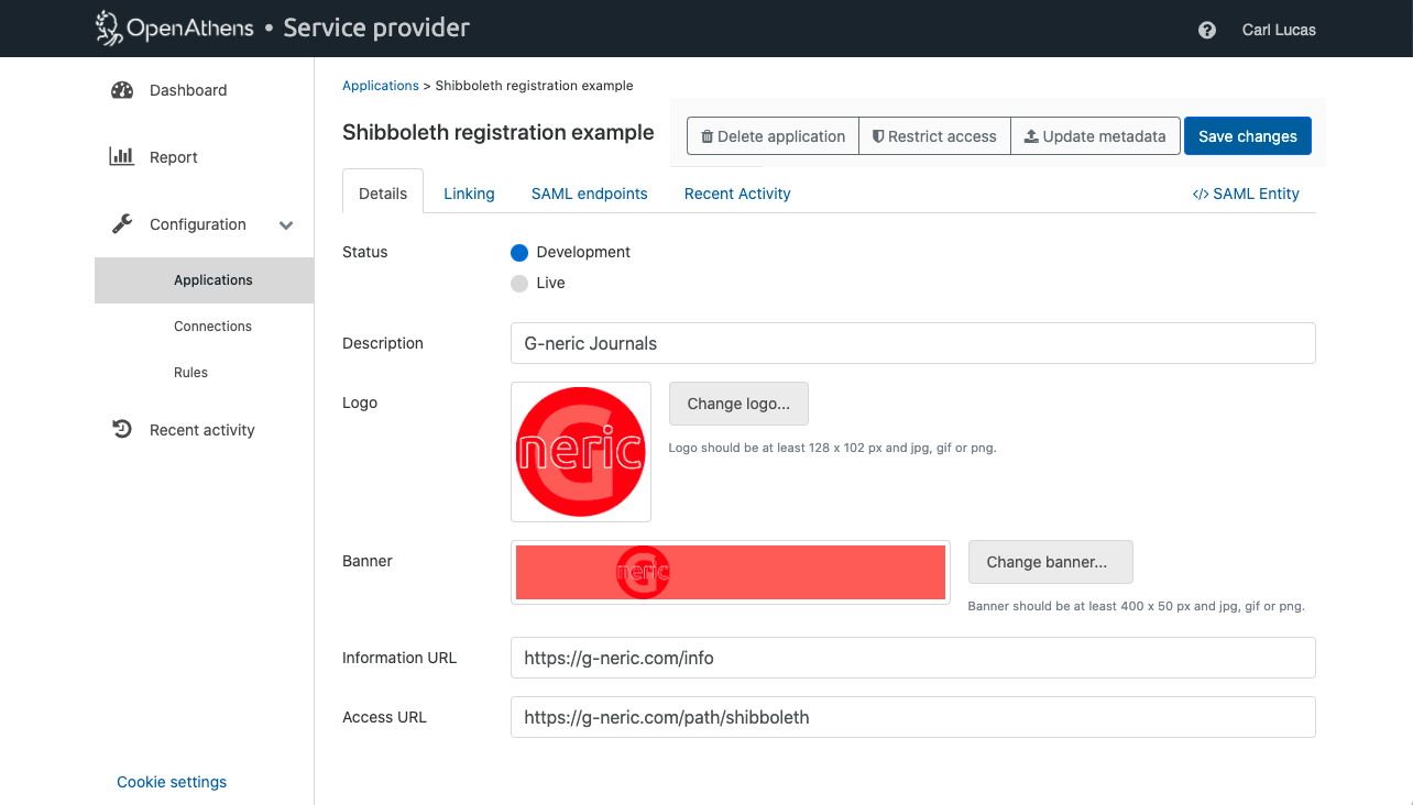 <SAML> entity tab (External applications only - e.g. Shibboleth)