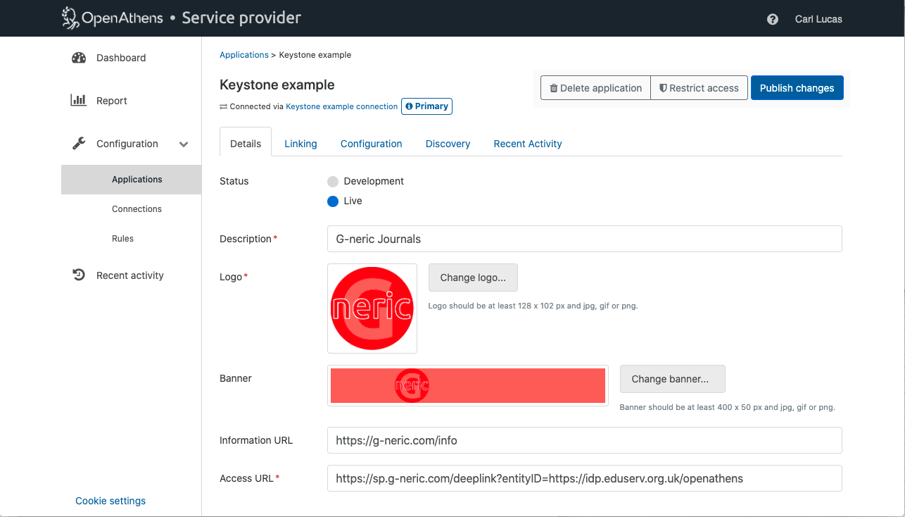 When you are ready to go live in the OpenAthens federation you can set this to live. It always appears for external applications, but will not appear for Keystone applications until the OpenAthens federation is added to the connection.