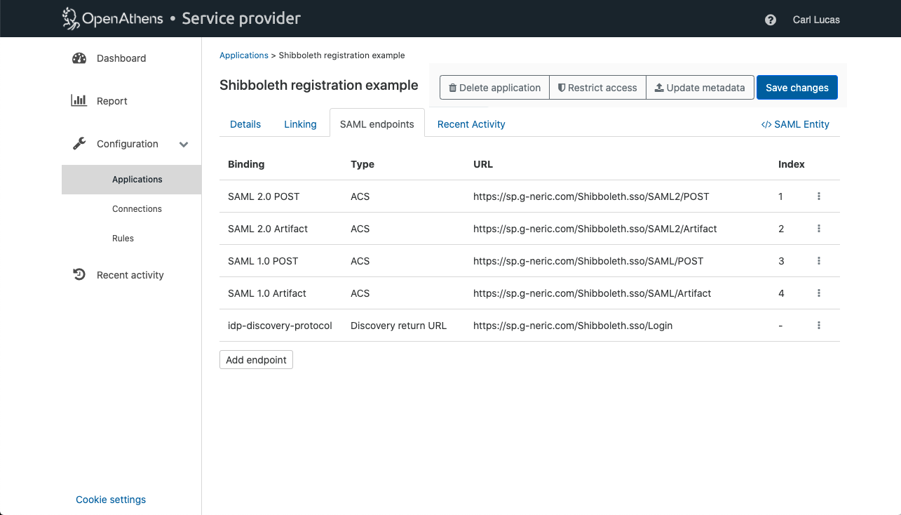 SAML endpoints (External applications only - e.g. Shibboleth)