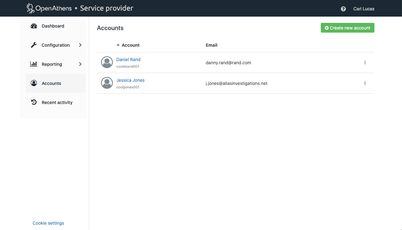 To manage OpenAthens administrator accounts which can be used to access the publisher dashboard, click accounts in the side menu: