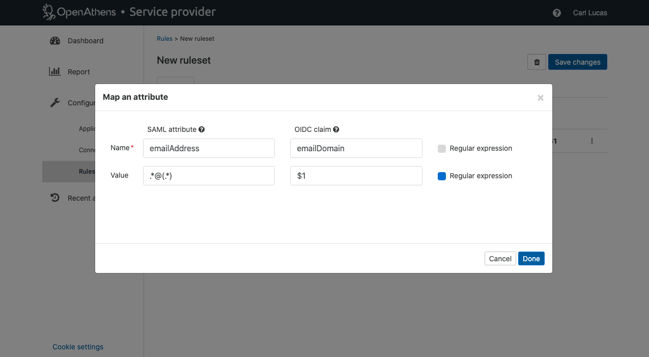 As you would imagine, a mapping process exists so that you can specify an incoming and outgoing attribute names. These mappings are defined under the rules menu, and need to be switched on or off on the connection used by the application. Where a connection is used by multiple applications, the rules will apply to all the applications.