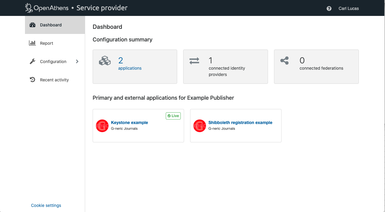 Here, you can manage your applications and connections. The applications section deals with the presentation of external applications within the OpenAthens federation and the configuration of Keystone. The connections area is dedicated to how Keystone sets up federation memberships.