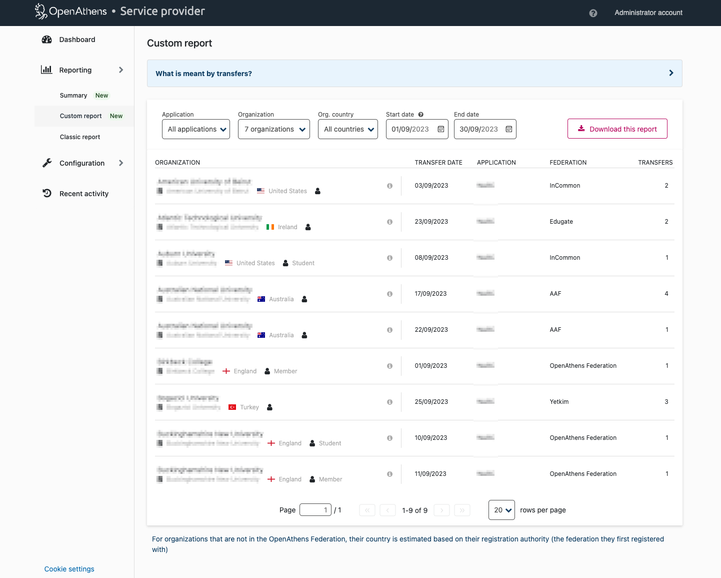 You can select for applications, organisations, countries, and date ranges. Applications, and especially organisations and countries can be a long list so are searchable. The country will be that of the federation the organisation is first registered in unless they're one of ours in which case we use our own customer data. External apps will only show the OpenAthens federation.