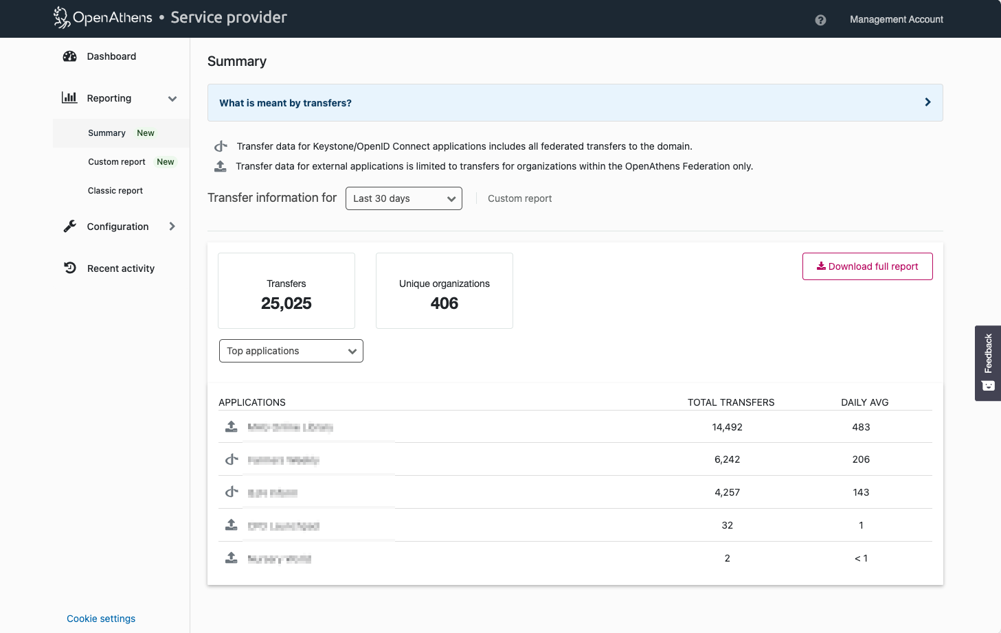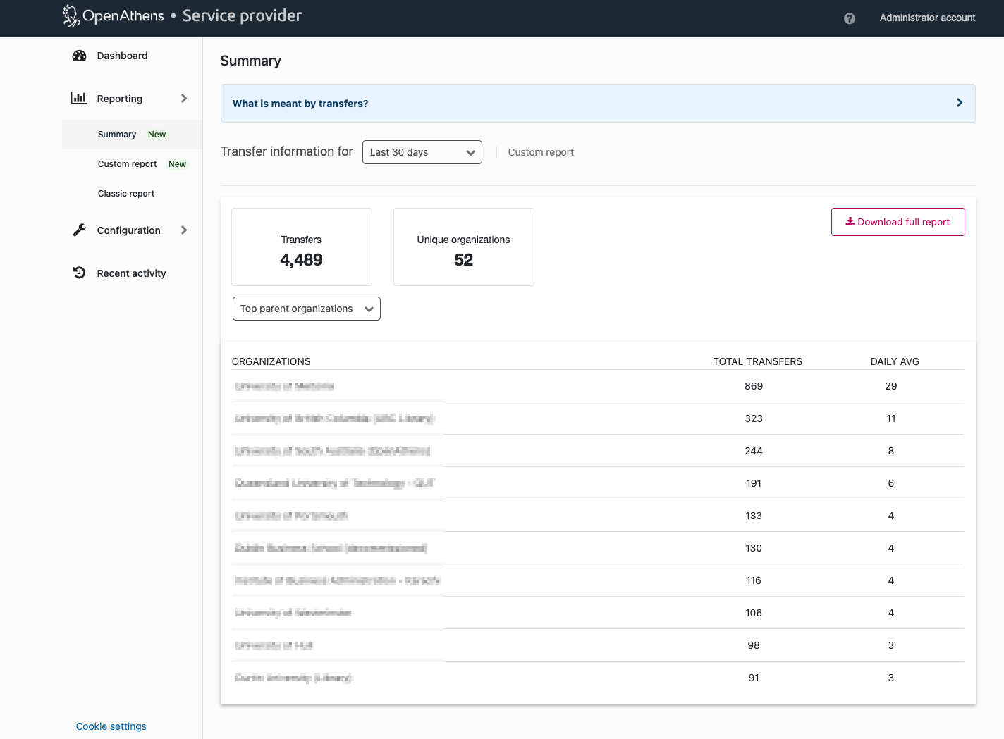 OpenAthens’ reporting uses ‘transfers’ as the unit of measurement and UTC for the dates and times. A transfer is when your system sends the user to their home organisation and that organisation sends them back with attributes and it's that sending back we count. UTC is Coordinated Universal Time: https://en.wikipedia.org/wiki/Coordinated_Universal_Time