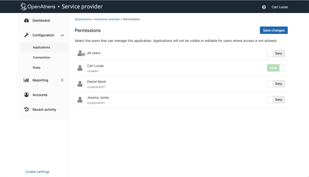 To control access, first change the all users setting to deny to enable the other switches, then toggle the users you want to allow and click save (your master account will always be allowed to access all applications and connections).
